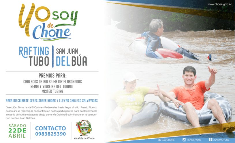 Un evento de tubing tour se realizará este sábado 22 de abril en el sitio Puerto Nuevo de la Parroquia Chibunga (Chone), con el propósito de fomentar el turismo en esta zona cruzada por la carretera que lleva hasta el Cantón El Carmen.