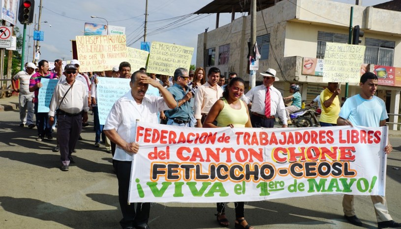 En Chone los sindicalistas se unieron y a las 9 de la mañana se dio inicio a un desfile que salió desde el triángulo en la Avenida Eloy Alfaro y recorrió las calles Vargas Torres y Bolívar hasta llegar a la Plaza Sucre. Allí, en la explanada del palacio municipal, subidos a una camioneta los dirigentes de varias instituciones locales pronunciaron sus respectivos discursos.