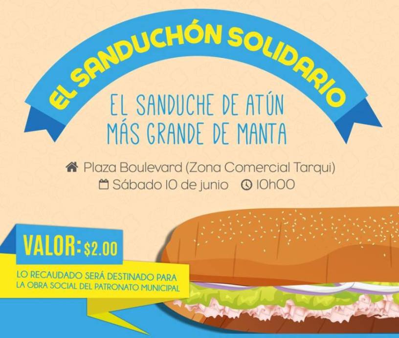 El sábado 10 de junio de la presente semana, desde las 10h00, la Plaza Boulevard de la Zona Comercial Nuevo Tarqui (Manta) es el escenario donde se presentará un vibrante show musical para animar la venta de “El Sanduchón Solidario” preparado con atún; y, por carambola, impulsar las ventas en todos los negocios establecidos en ese lugar de reciente creación.