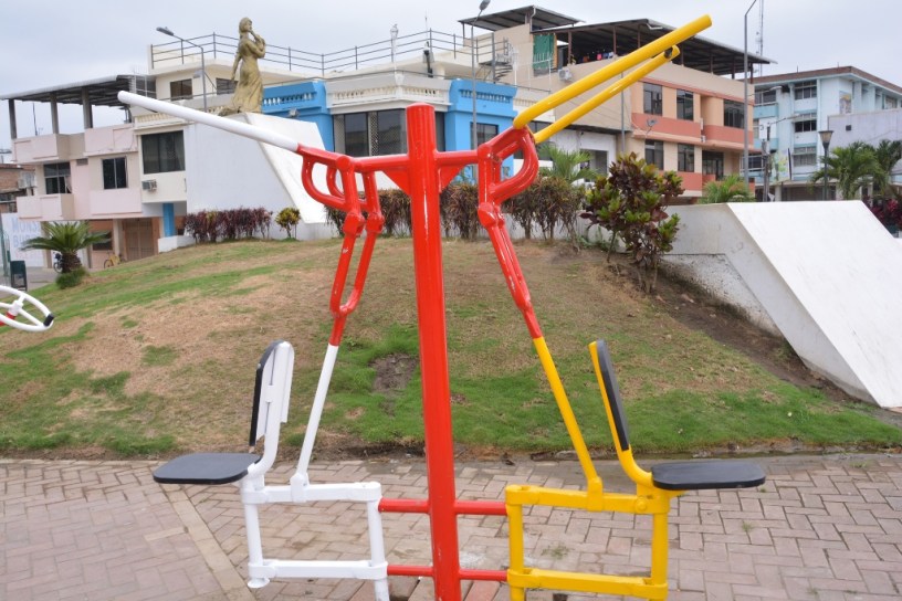 Jóvenes y adultos vuelven a utilizar libremente las máquinas para ejercicio corporal rehabilitadas en el Parque de la Madre, uno de los más visitados en la ciudad de Chone. </ p>
