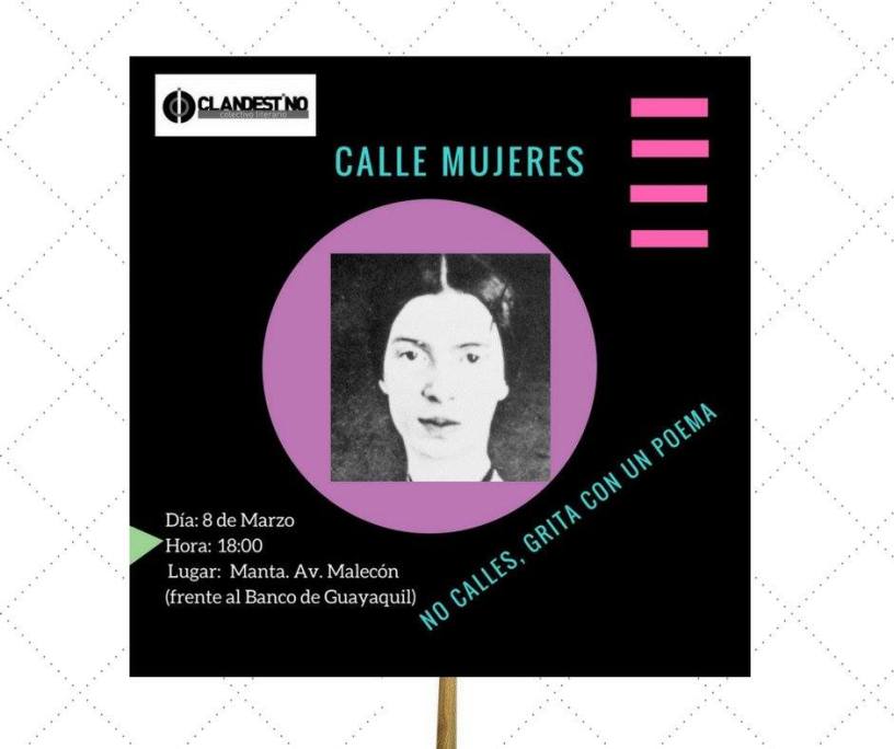 Las organizadoras pertenecen al Colectivo Literario Clandestino, que para el efecto se han unido a un grupo de mujeres periodistas, escritoras y gestoras culturales. Todas ellas son parte de esta novedosa iniciativa y esperan que cualquier mujer que se entere de esto a tiempo, se sume con su presencia y participando en la lectura de las poesías, de las cuales habrá suficientes copias.