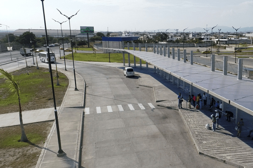 Ingreso al terminal.- Los autobuses que vienen del centro de Manabí y de la zona sur de la provincia, en el redondel de La Tejedora deberán tomar la vía antigua de ingreso a Manta, pasando por La Fabril, el Hospital del IESS y la Ciudadela la Aurora hasta llegar a la bifurcación (La Y) y avanzar por la Avenida 113 hasta la Avenida María Auxiliadora (UVC de la Policía); por ésta seguirán hasta el redondel de El Paraíso, y desde aquí tomarán la vía hacia El Palmar para llegar al terminal terrestre.
