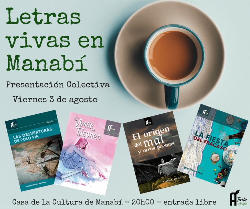Esta velada está hecha al alimón por Tinta Ácida Ediciones (Manta) y la Casa de la Cultura anfitriona (Portoviejo: Calle Sucre y transversal García Moreno), que harán la presentación colectiva de estos cuatro libros: La fiesta del fracaso, de Ignacio Loor Vera; El origen del mal y otros poemas, de Carlos Coello García; El amor en tacones, de Natalí Romero Torres; y, Las desventuras de Polo Pin, de Jorge Zambrano Mendoza (Todas, publicaciones de Tinta Ácida Ediciones).