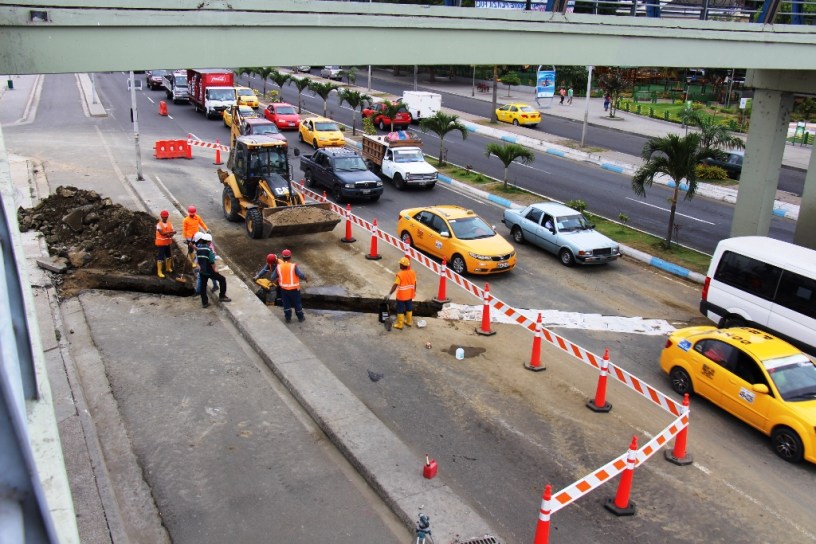 Una alcantarilla antigua, soterrada transversalmente debajo de la Avenida Jaime Chávez Gutiérrez (malecón) de la ciudad de Manta, y cuya función de evacuar hacia el mar el agua de las lluvias había colapsado, acaba de ser cambiada por una nueva.