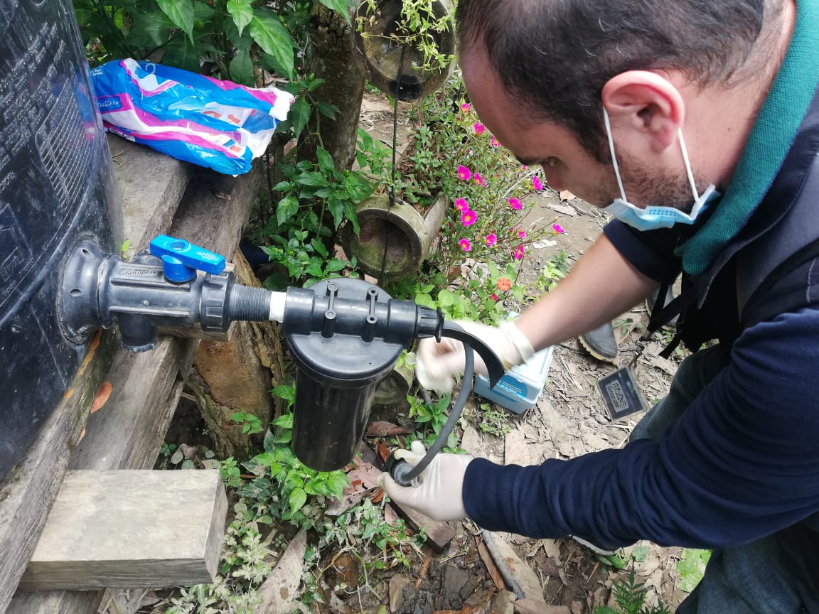 Tomando muestra del agua que beben comunidades rurales de Santa Ana.