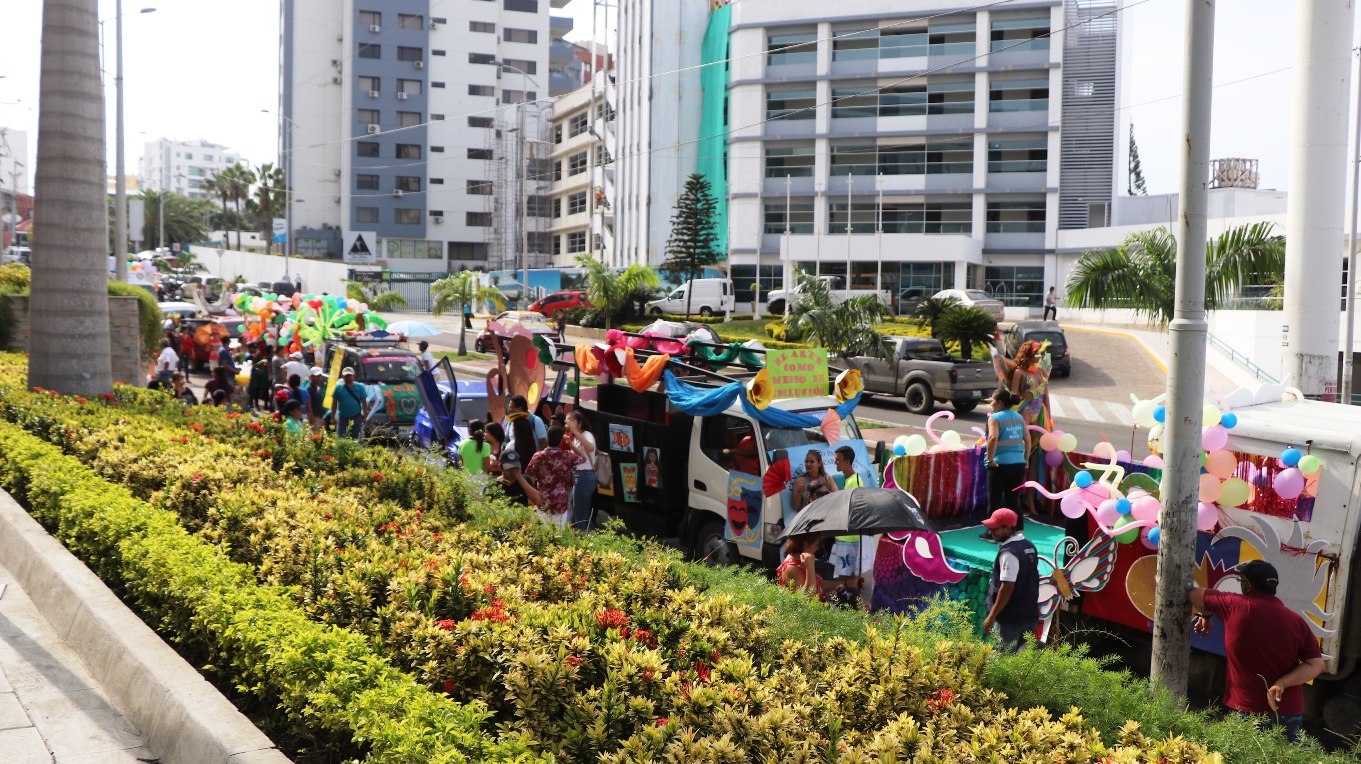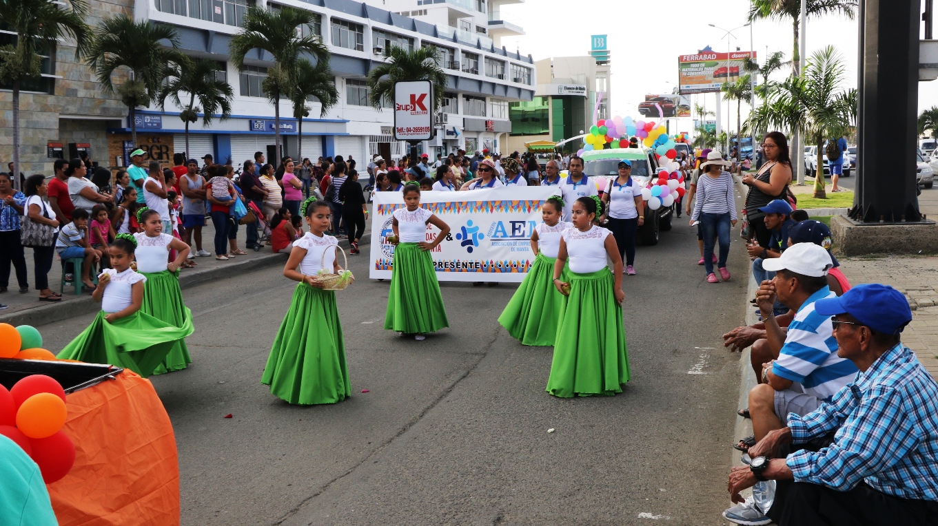 Carros alegóricos, comparsas luciendo atavíos multicolores, bandas musicales de la Policía Nacional, las escuadras del Cuerpo de Bomberos de Manta, la delegación de la Unidad Educativa María Auxiliadora, llamaron la atención del público mientras recorrían desde el redondel vial situado frente al Hotel Oro Verde hasta la Plaza Cívica Eloy Alfaro.