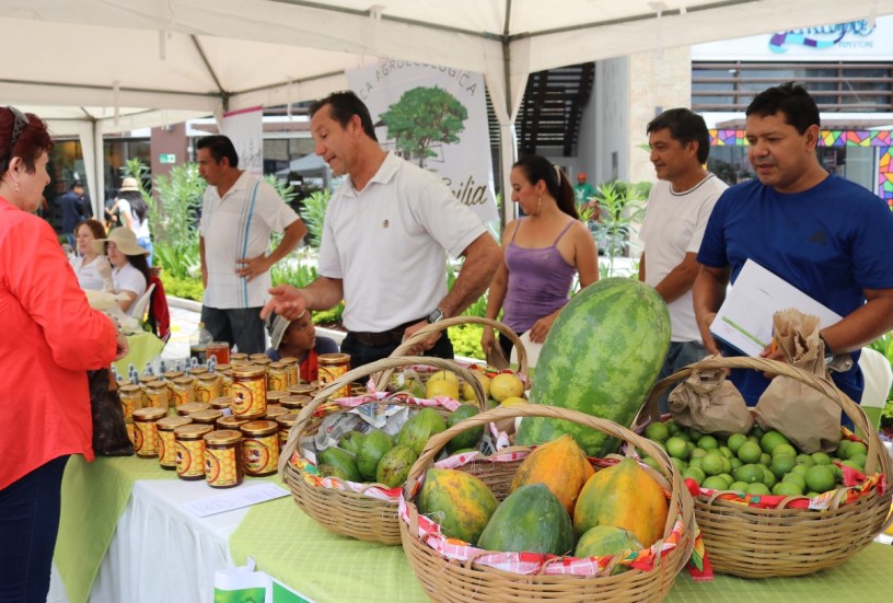 Diez familias cultivadoras expusieron sus respectivas cosechas de esos huertos. A ellas se sumaron las muestras de productos elaborados o semielaborados por varios emprendedores pertenecientes a la Asociación Agroecológica de Manabí, que básicamente producen esencias y masas a partir de frutos naturales.