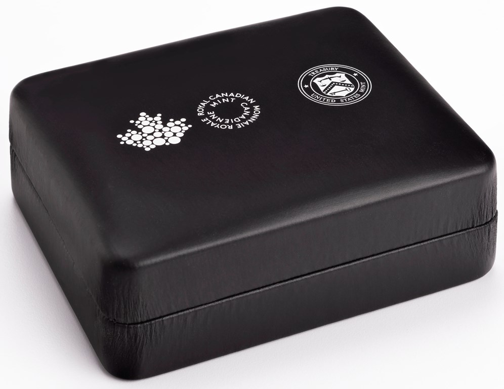 Estas hermosas monedas de colección vienen dentro de un estuche especial que lleva los logotipos de las casas de la moneda de Canadá y Estados Unidos. Dentro, un certificado adornado con imágenes de las banderas de ambos países suma un toque de color de gran atractivo visual.