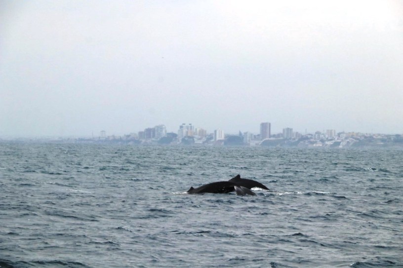 Las ballenas jorobadas (cuyo nombre científico es Megaptera novaengliae), peces marinos que pueden alcanzar una longitud de 30 o más metros, y un peso de 40 toneladas o más, se dejan ver ahora en su periodo de apareamiento frente a la costa de la ciudad de Manta.
