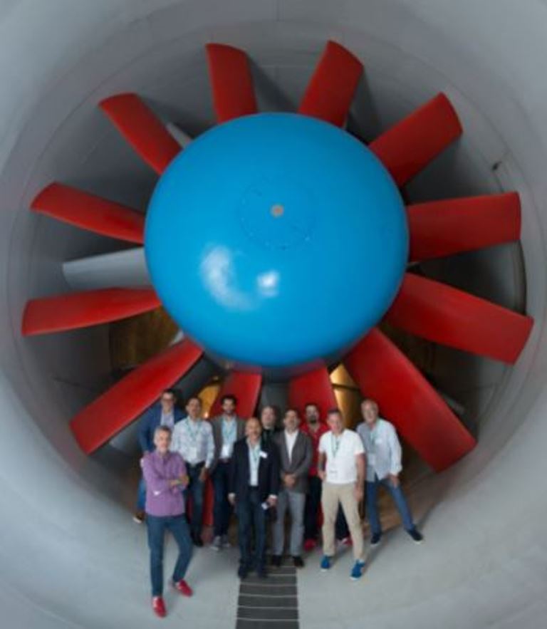 Los periodistas, al pie de la gran turbina del túnel de viento.