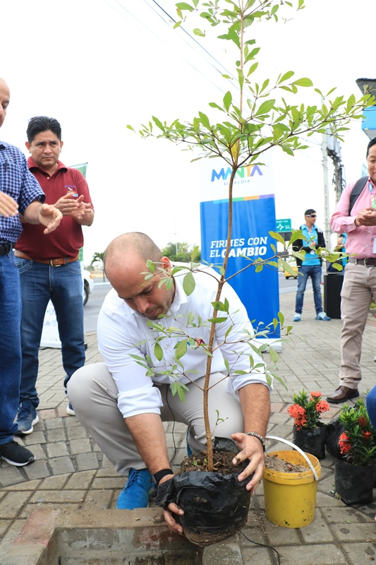 El alcalde de Manta, Agustín Intriago, planta un árbol en la esquina del malecón y la Calle 9.
