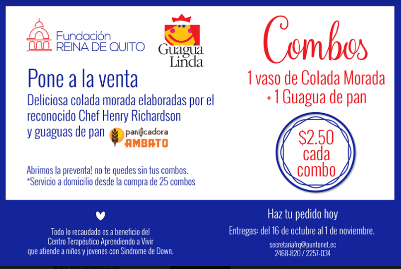 Año tras año, la Fundación Reina de Quito ha creado iniciativas para promover la solidaridad en la ciudadanía y llevar alegría a muchos hogares. La deliciosa colada morada y exquisitas guaguas de pan serán un medio para recaudar fondos para el tratamiento de niños y jóvenes del Centro Terapéutico Aprendiendo a Vivir.