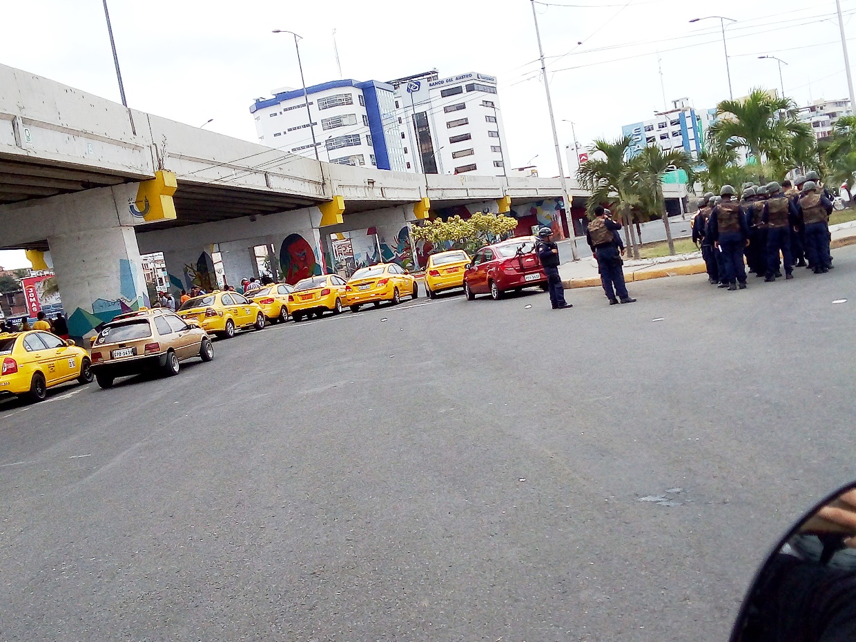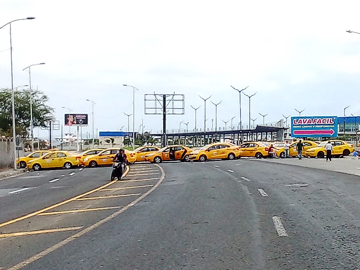 Las puertas de acceso y salida de autobuses en el terminal terrestre (nororiente de la urbe), estaban rodeadas de muchos taxis y autobuses a fin de impedir la entrada o salida de los vehículos.
