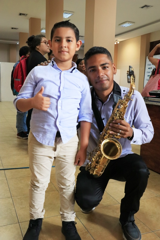 El saxofonista de la Orquesta Sinfónica Juvenil, Azael Izaguirre, y el niño Matías Flores, con sus excelentes ejecuciones musicales motivaron a los asistentes, entre ellos los estudiantes que corearon sus canciones y pedían más.