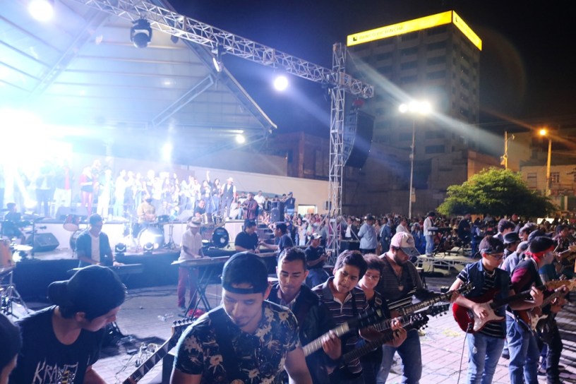 20 guitarristas, 12 bateristas, 15 pianistas, 15 bajistas y 35 vocalistas, sincronizaron sus instrumentos y voces para interpretar, todos al mismo tiempo, temas musicales previamente ensayados. Ocurrió en la Plaza Cívica Eloy Alfaro Delgado, durante la noche del lunes 4 de noviembre del 2019.