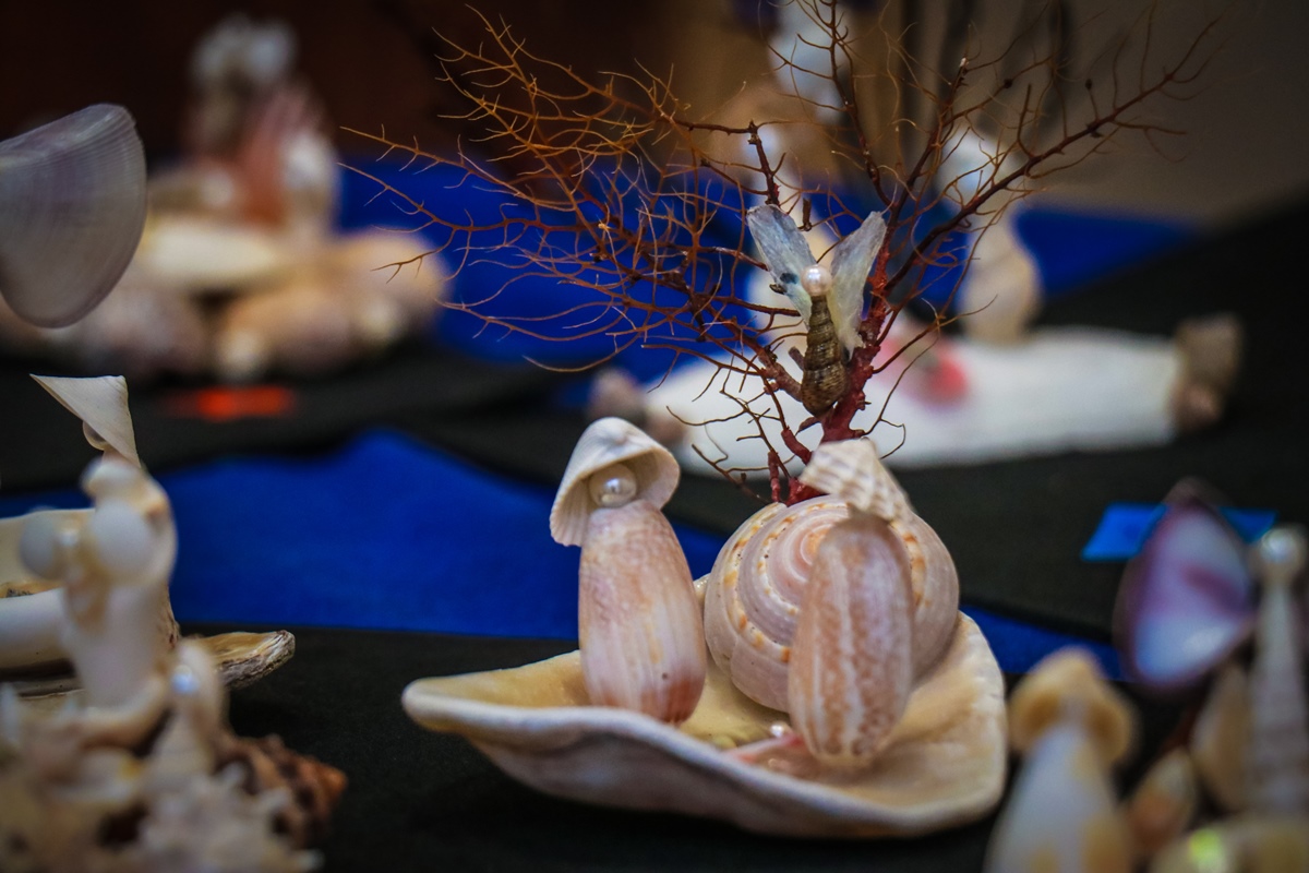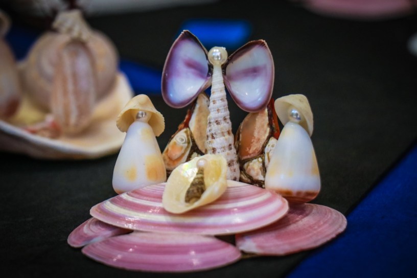 Un botón de muestra: los delicados pesebres en miniatura, elaborados por Jacqueline Simons utilizando conchillas recogidas en playas de muchos lugares.
