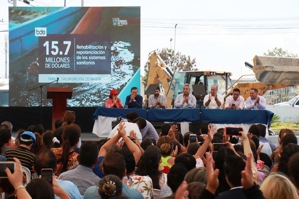 En su visita a la ciudad puerto, este viernes 13 de diciembre del 2019, Moreno atestiguó la suscripción de un convenio de crédito entre el Banco de Desarrollo del Ecuador (BDE) y el Gobierno municipal de Manta, por el cual el primero desembolsará más de 15 millones de dólares para remediación sanitaria en diversos lugares de la urbe.