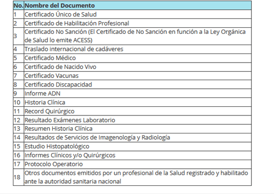 Desde el mes de diciembre en curso, la Agencia de Aseguramiento de la Calidad de los Servicios de Salud y Medicina Prepagada (ACESS) del Ecuador, es la entidad oficial encargada de certificar documentos sanitarios emitidos por profesionales de la salud, registrados y habilitados ante la autoridad sanitaria correspondiente, atribución que venía siendo ejecutada por el Ministerio de Salud Pública.