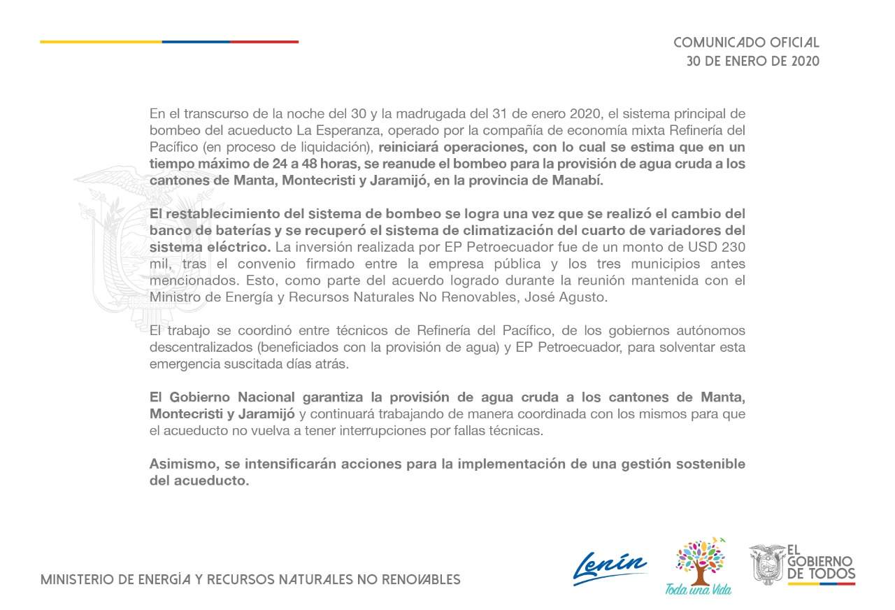 Mediante comunicado público difundido durante la noche de este jueves 30 de enero del 2020, el Ministerio de Energía y Recursos Naturales No Renovables del Ecuador anunció que el acueducto La Esperanza – El Aromo volverá a funcionar en esta madrugada y que, a partir de ahí, el reabastecimiento de agua cruda a los cantones Manta, Jaramijó y Montecristi tardará un máximo de 48 horas.