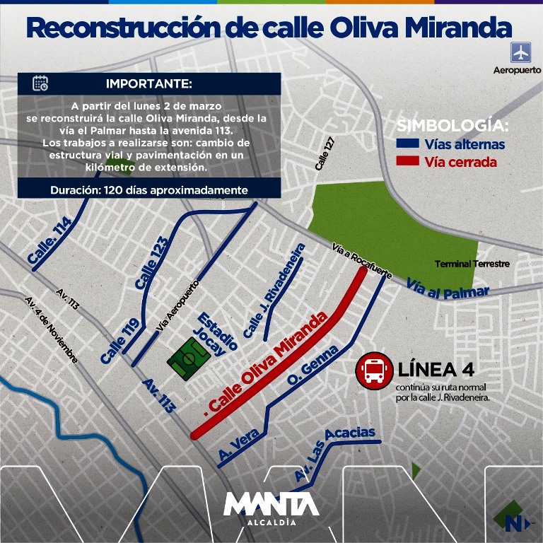 La Línea 4 de los autobuses que sirven dentro de la ciudad, continuará su ruta normal por la Calle J. Rivadeneira, que atraviesa la Calle Oliva Miranda.
