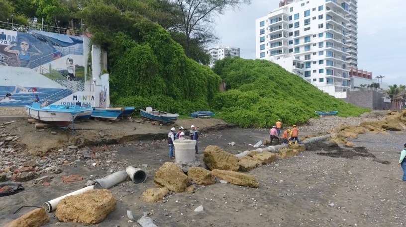 Personal técnico y operativo de la EPAM (Empresa Pública Aguas de Manta), repara desde el martes recién pasado el colector de aguas servidas de la vetusta Estación Umiña (Playa El Murciélago) y su línea de impulsión hacia las lagunas de oxigenación. Estas estructuras continúan siendo golpeadas por el fuerte aguaje marino que azota en estos días a la costa ecuatoriana y los daños dan lugar a la contaminación de la playa.