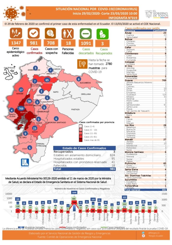 Hoy a 24 días del primer caso, el país tiene 981 contagiados, 708 casos con sospecha, 1347 en el cerco epidemiológico, 18 fallecidos. El virus está en 18 provincias. Guayas mantiene la cifra más alta. Señores empresarios de CEIPA, Manta con 20 casos es el epicentro de los contagios en Manabí, que suma al momento 27 casos. Y los números seguirán subiendo…
