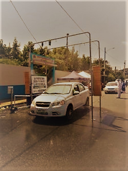 Los vehículos que ingresan (solo los autorizados por las disposiciones oficiales) pasan por este sistema turbo atomizador que los rocía con el químico descontaminante.