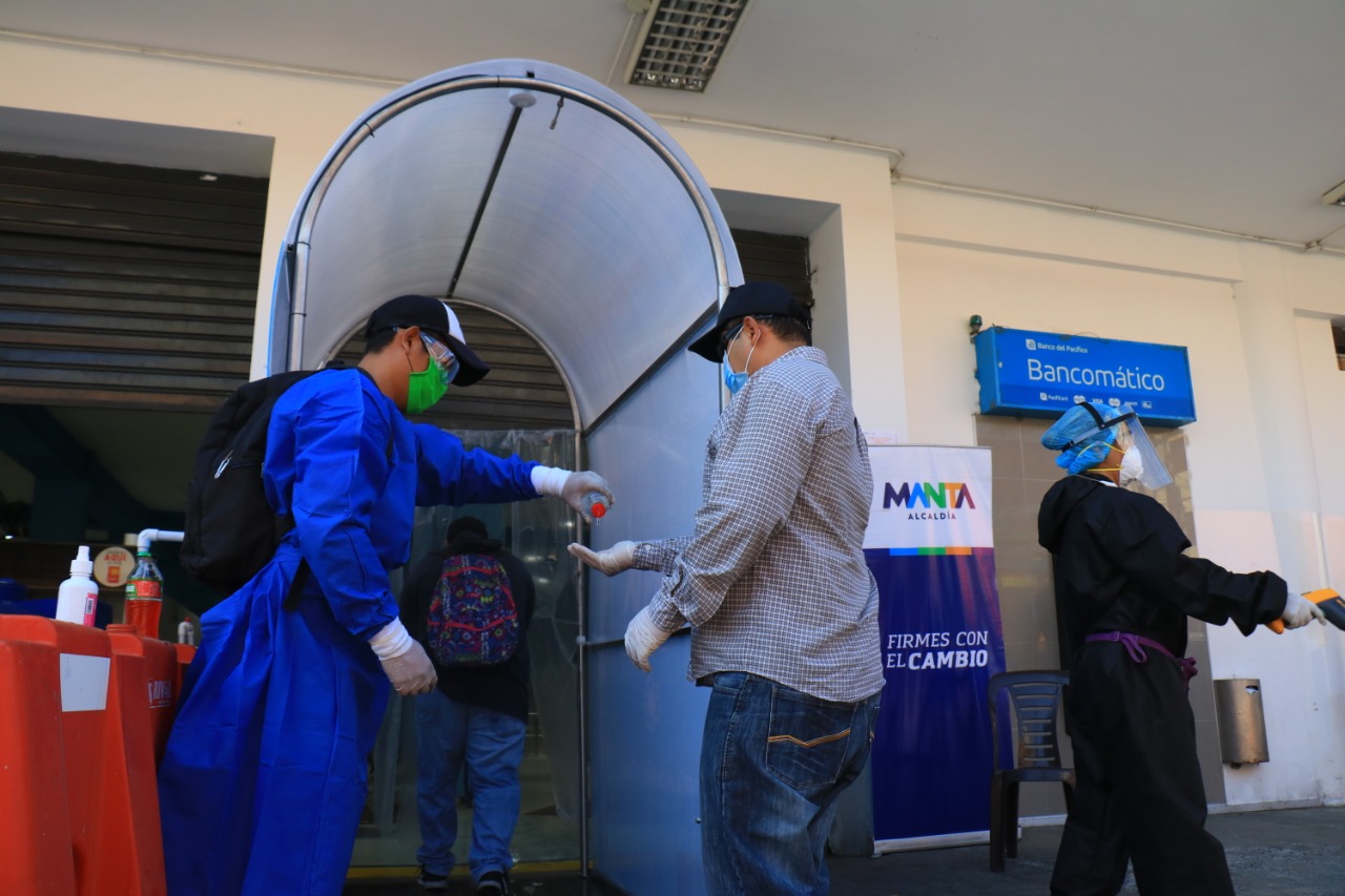 Dos túneles para desinfección de personas y prendas fueron instalados en los mercados municipales Central y Los Esteros (uno en cada caso) de Manta, para intensificar las medidas de prevención contra el coronavirus. Esta acción fue realizada por la Administración cantonal, instalando las estructuras en la parte exterior de la única puerta principal de acceso al respectivo centro de abastos.