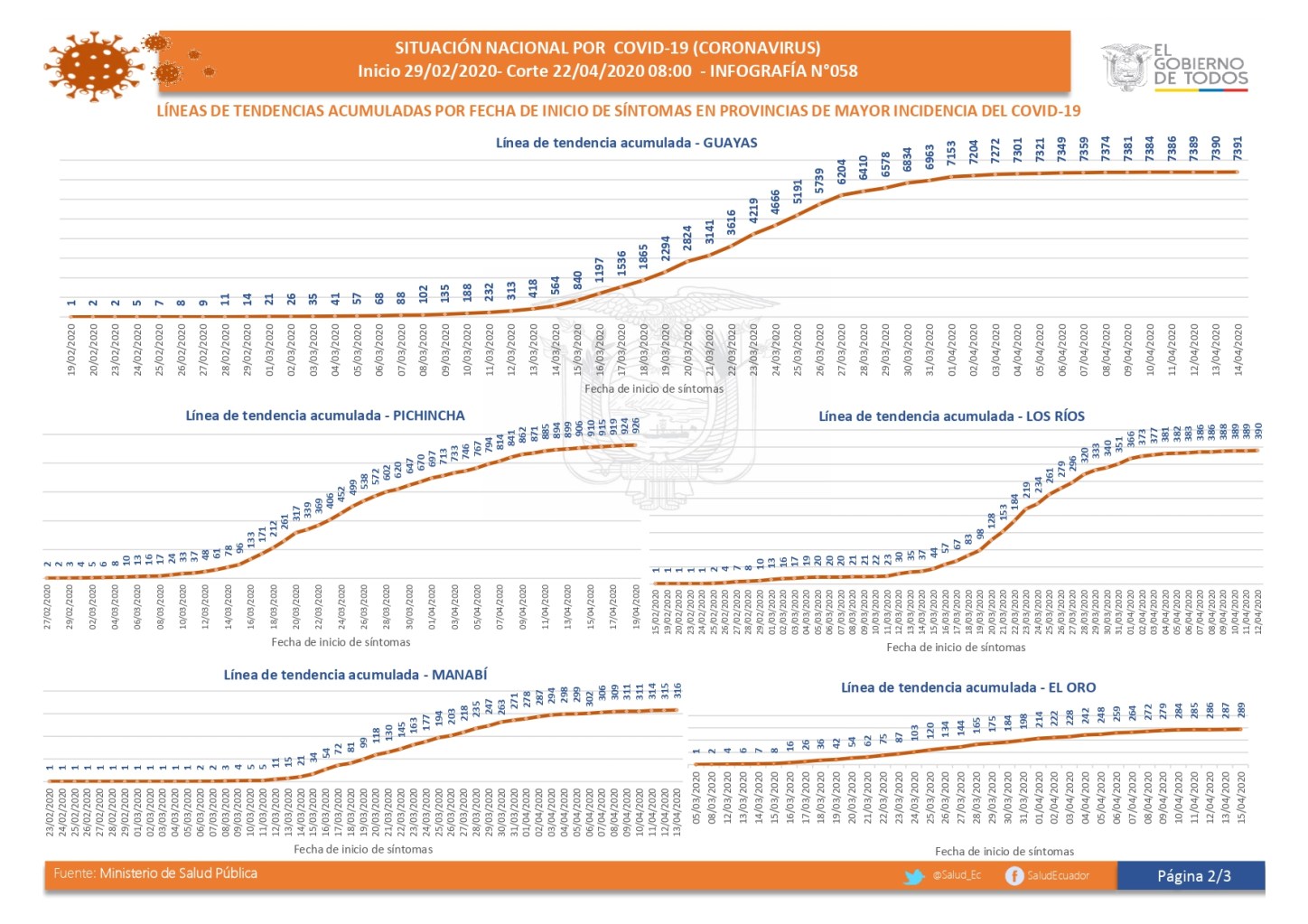 Mostramos a continuación las tres infografías del reporte diario del Ministerio de Salud Pública (MSP) del Ecuador acerca de cómo avanza el coronavirus en este país suramericano. Corresponden al día de hoy, miércoles 22 de abril del 2020, con corte contable a las 08h00.