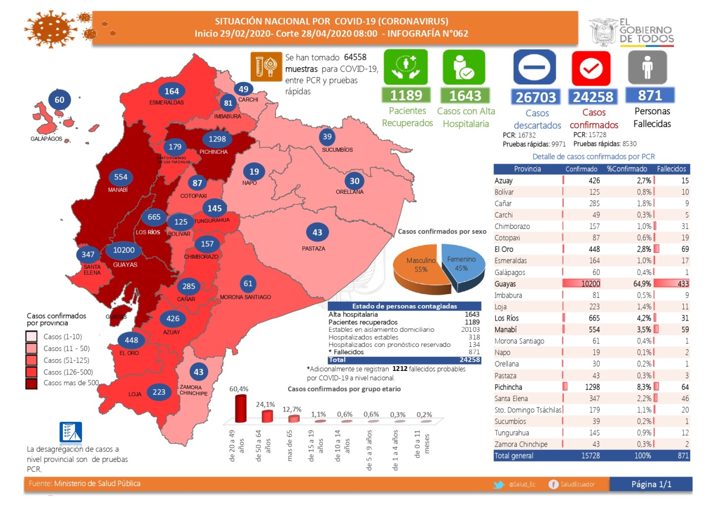La cifra total de muertes en Ecuador a causa de la COVID-19 sobrepasa los 2.000, según el reporte del Ministerio de Salud Pública (MSP) cortado a las 08h00 de hoy, martes 28 de abril del 2020. Y los contagios confirmados se aproximan a 25 mil.