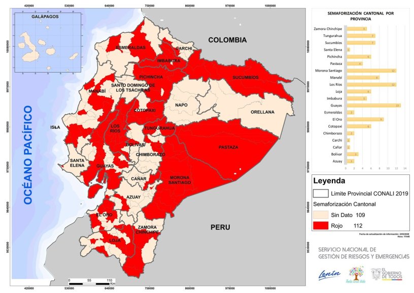 Hasta las 16h00 de hoy, sábado 02 de mayo del 2020, solo 112 cantones del Ecuador habían comunicado su decisión de empezar la semana con el semáforo en rojo, pero el COE nacional advirtió que, si los demás callan, todo el país funcionará en rojo desde el próximo lunes.