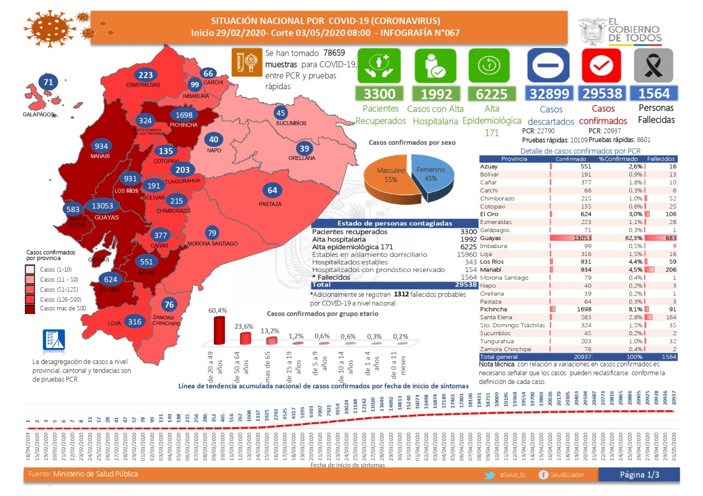 El total nacional de muertes asciende a 2.876. De esta cifra, 1.564 son los fallecimientos cuya causa fue la COVID-19, según las pruebas confirmadas; y, 1.312, corresponden a defunciones cuyas causas no fueron probadas, pero los síntomas que mostraban los pacientes hacen pensar que también fueron atacados por el coronavirus SARS-CoV-2.