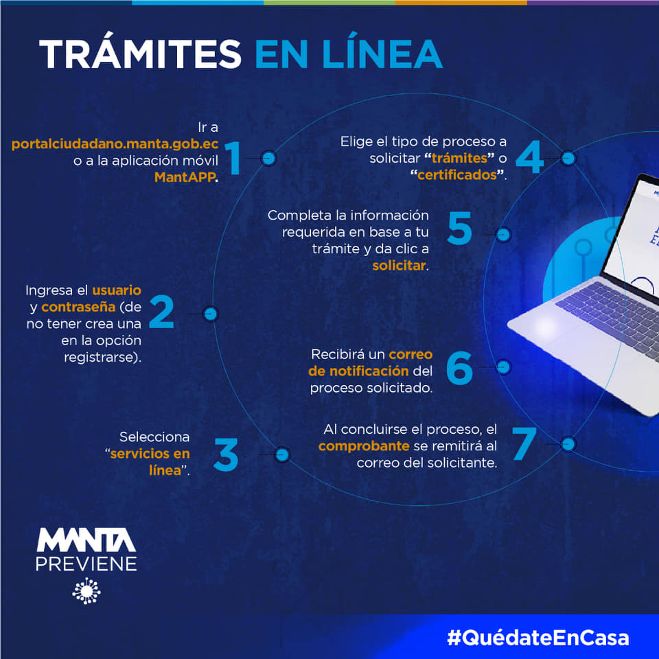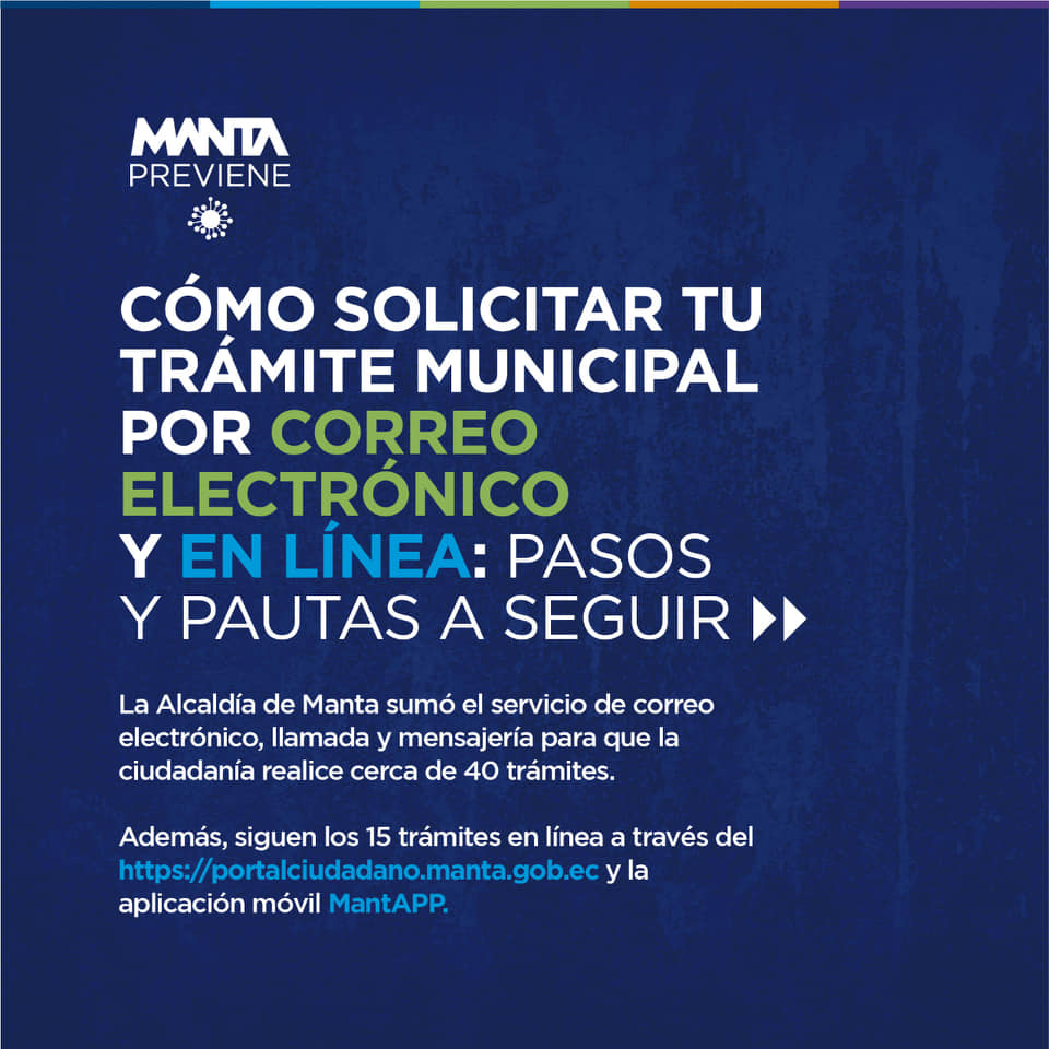 Desde la fecha en que surgió la disposición del aislamiento social a causa de la pandemia mundial por la propagación de la enfermedad COVID-19, el GAD municipal de Manta adaptó y reforzó nuevos mecanismos para los trámites que antes se atendían únicamente de manera presencial en ventanilla.