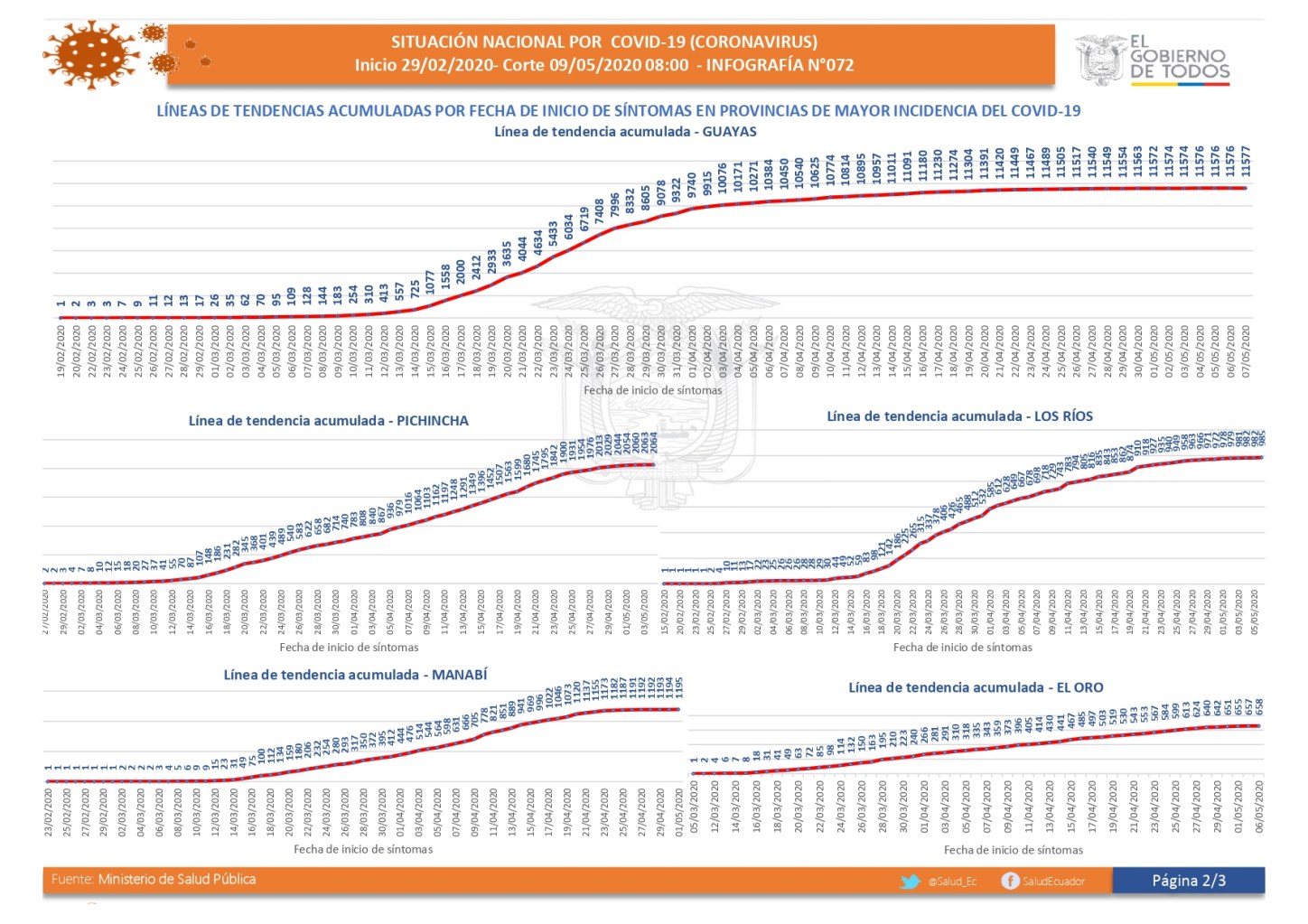 Según el Ministerio de Salud Pública (MSP), con cifras cortadas a las 08h00 de hoy, sábado 9 de mayo del 2020, en este país ya se han realizado 83.657 pruebas de laboratorio (entre las PCR y las rápidas) con el siguiente resultado: 29.071 casos de COVID-19 confirmados, 1.717 muertes, 6.950 con alta epidemiológica, 3.433 pacientes recuperados, 2.566 con alta hospitalaria y 32.860 casos descartados (A la cifra de muertes debe sumarse otras 1.912, que se presume ocurrieron por la misma causa).