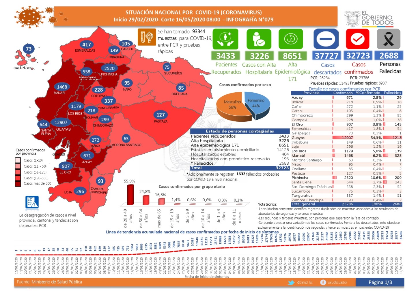 Les dejamos con las tres infografías del reporte ministerial, con corte contable a las 08h00 de hoy, sábado 16 de mayo del 2020, pero publicado a las 14h00.