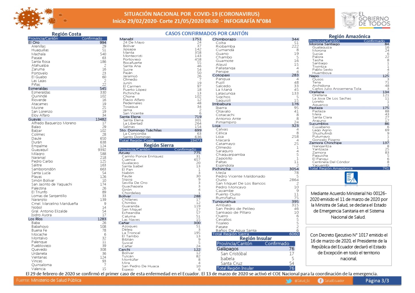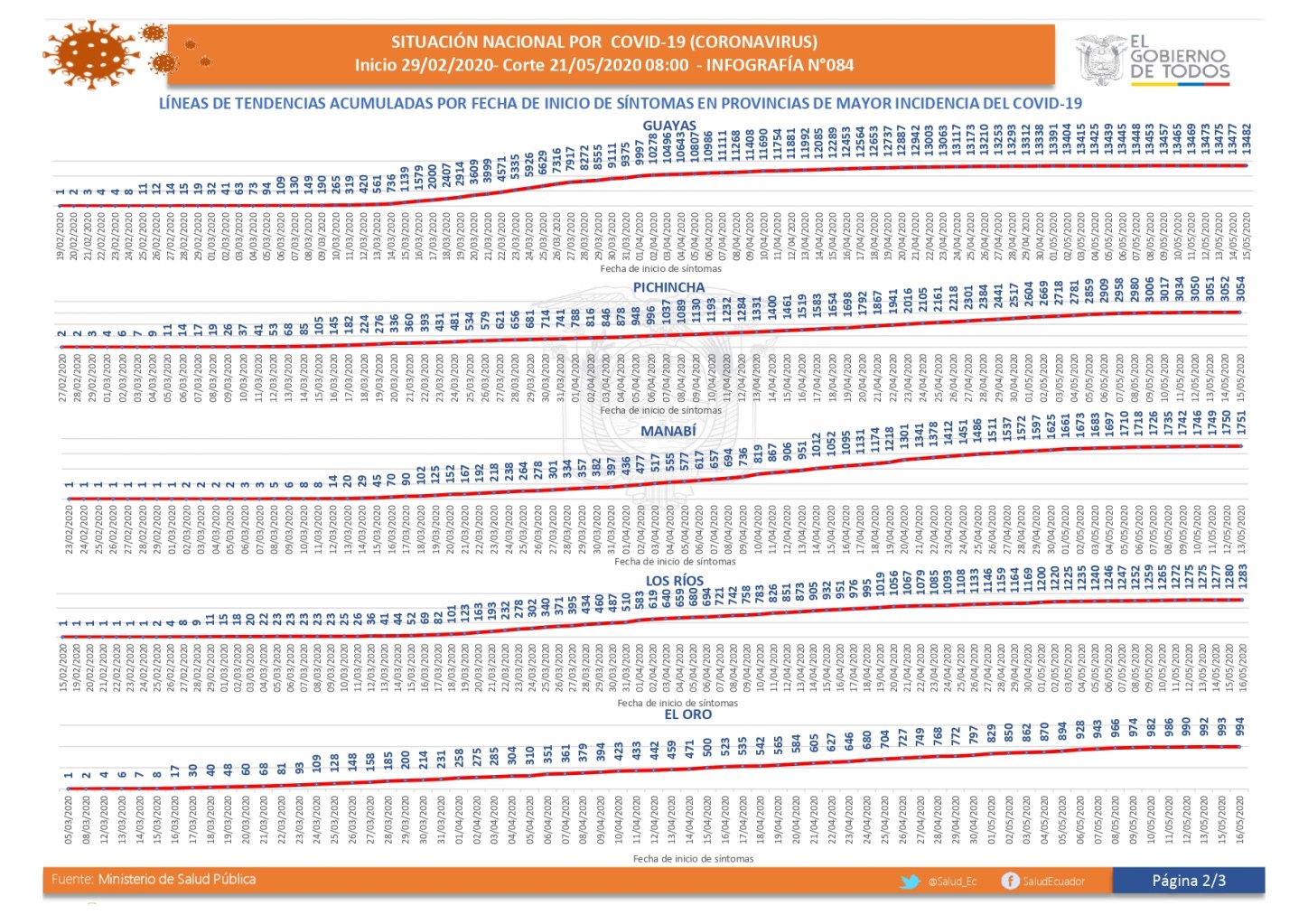 Esta información contiene las tres infografías elaboradas por el Ministerio de Salud Pública (MSP) con los datos cortados a las 08h00 de hoy, jueves 21 de mayo del 2020.