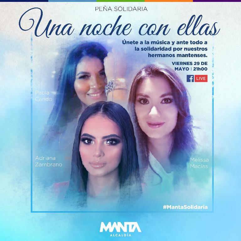 La función, programada y coordinada por la Administración municipal de Manta, ha sido nombrada “Una noche con ellas” y tendrá el formato de una peña solidaria. Se realizará el viernes 29 de mayo, desde las 21h00, mediante Facebook Live (streaming o transmisión televisiva en el instante) por la página que el Municipio de Manta tiene en esa plataforma de Internet.