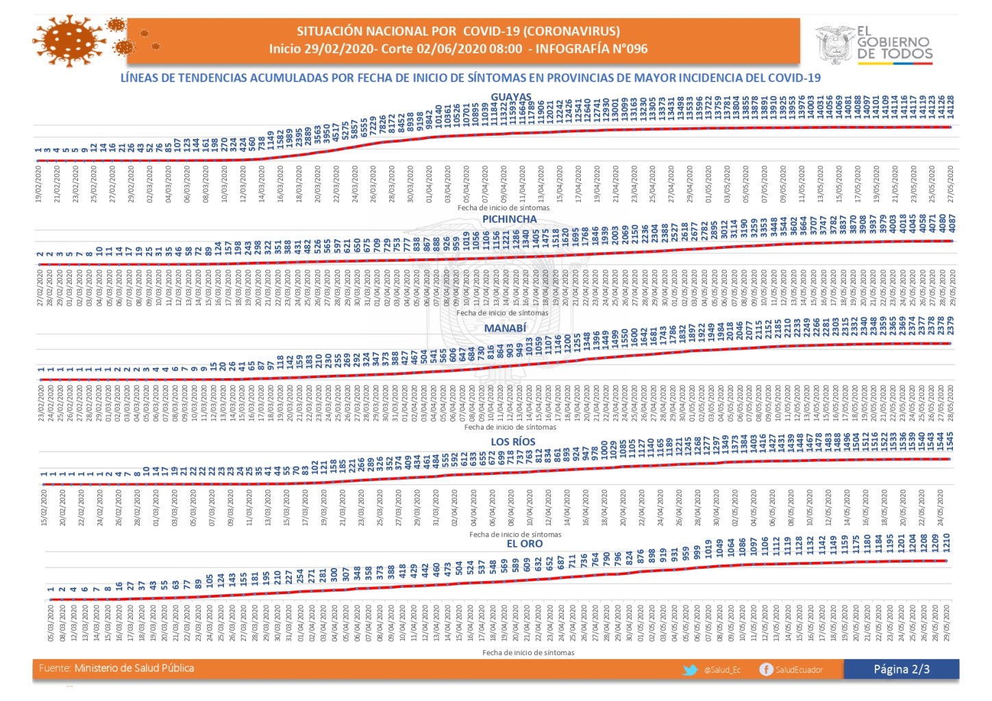 El nuevo reporte del Ministerio de Salud Pública (MSP) del Ecuador, contablemente cortado a las 08h00 de hoy, martes 02 de junio del 2020, y divulgado al mediodía, no deja dudas de que el contagio por coronavirus SARS-CoV-2 continúa y así mismo las muertes a causa de la covid-19, enfermedad provocada por aquel.