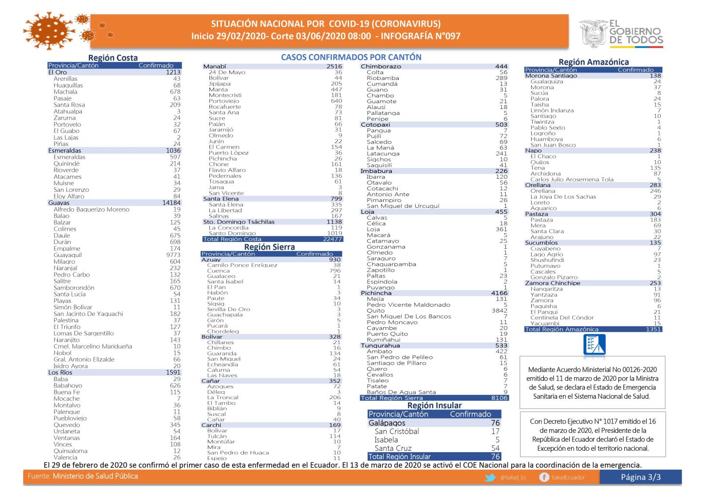 Veamos el reciente reporte del Ministerio de Salud Pública (MSP) del Ecuador, cuyo corte contable se dio a las 08h00 de hoy, miércoles 03 de junio del 2020.