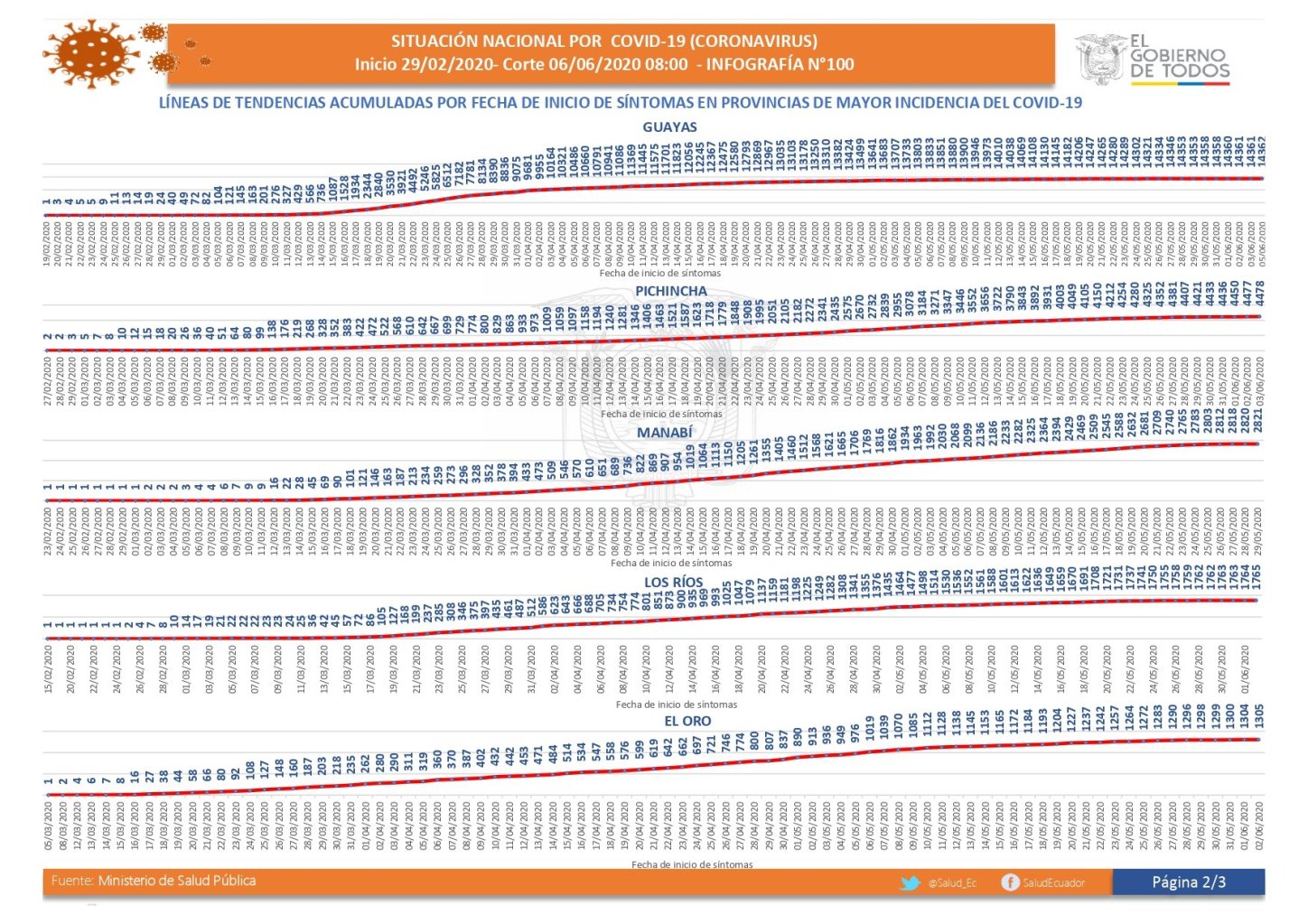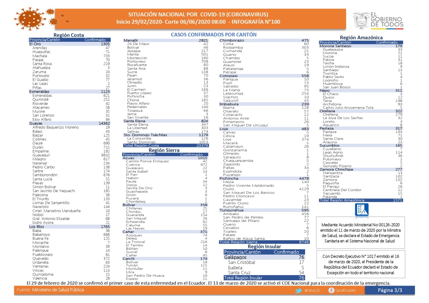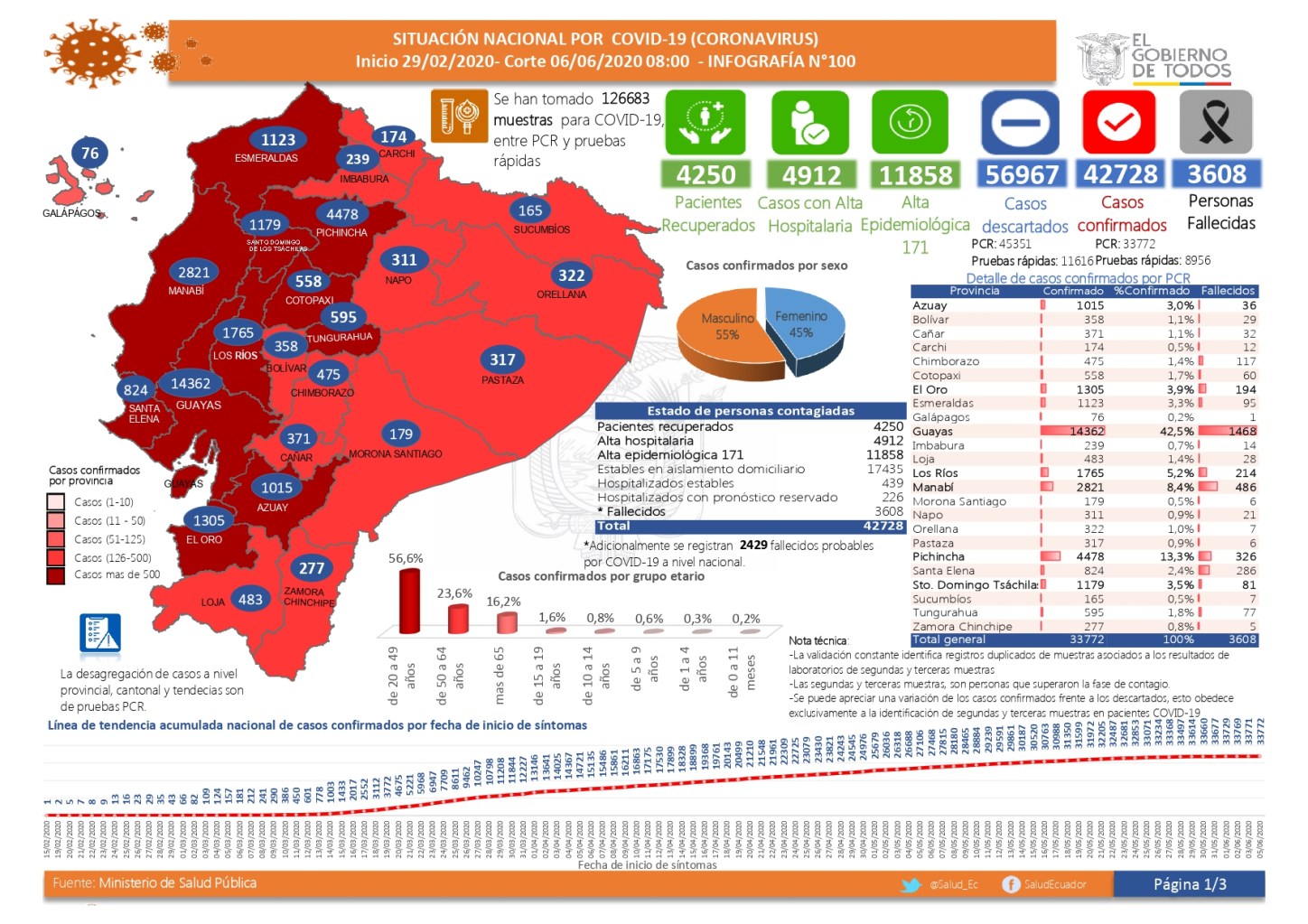 De acuerdo al más reciente reporte del Ministerio de Salud Pública (MSP), con corte contable a las 08h00 de hoy, sábado 6 de junio del 2020, y divulgado al mediodía, de un total de 126.683 pruebas clínicas realizadas, hay 42.728 casos de contagio confirmados, 3.608 muertes, 56.967 casos descartados, 11.858 altas del cerco epidemiológico, 4.912 altas hospitalarias y 4.250 pacientes que recuperaron su salud.