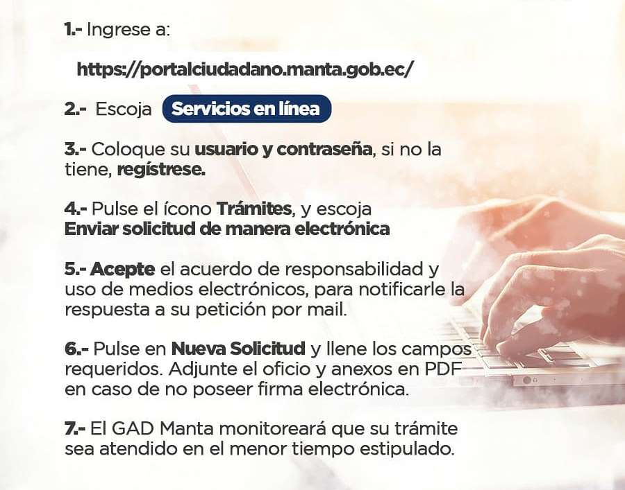Para realizar los trámites o solicitudes pueden ingresar a www.portalciudadano.manta.gob.ec.