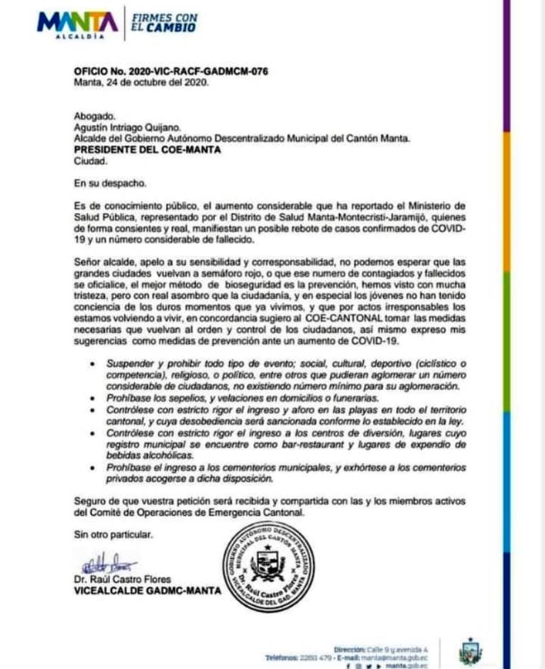 En las últimas semanas estaba notándose un aumento sustancial de casos COVID-19, con algunos fallecimientos, por lo cual autoridades locales de salud llamaron a redoblar esfuerzos para contener la nueva embestida. Incluso el vicealcalde de Manta, el médico doctor Raúl Castro Flores, remitió una carta con su firma al alcalde Agustín Intriago Quijano para recomendarle algunas medidas de precaución.