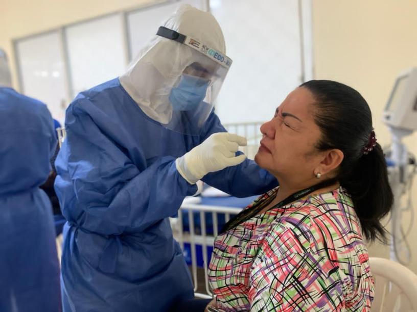 En el Hospital General Portoviejo se toman cada día entre 10 y 20 muestras de hisopado (por el hisopo o varita que se introduce en el órgano respiratorio), explicó la doctora Amelia Muñoz, médico ocupacional en esa casa de salud. Ella es responsable de velar por la salud del personal que labora internamente en el hospital, y está siempre presente durante la toma de muestras.