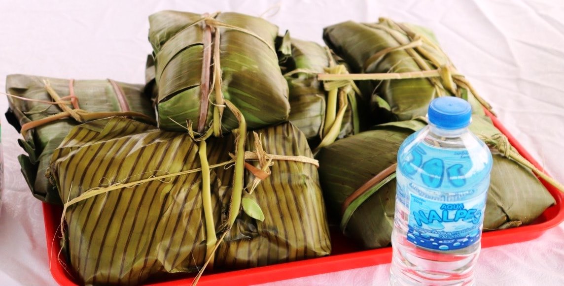 Este guiso va envuelto en hoja ahumada de la planta del plátano, sujeta con cuerda sapán o fibra extraída del tallo de esa herbácea.