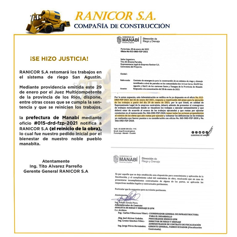 Con fecha 28 de enero del 2021, el ingeniero Fabián Zavala Pisco, administrador de contrato del Gobierno provincial de Manabí, se dirige al ingeniero Tito Álvarez Parreño, gerente general de Ranicor, S. A., notificándole que esta compañía debe reiniciar, el 29 de enero del presente año, los trabajos del proyecto de riego y drenaje San Agustín, en los cantones Sucre y Tosagua.