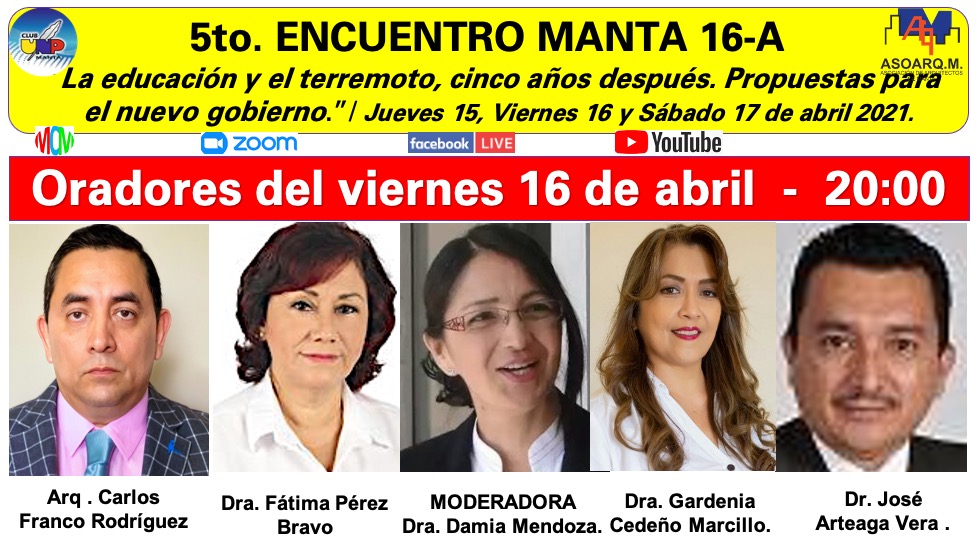 Desde las 20h00 del viernes 16 de abril/2021 continúa el 5to Encuentro Manta 16-A, segunda jornada, con la participación de cuatro ponentes y una moderadora de la exposición de propuestas para superar la crisis de la educación en el Cantón Manta y, por extensión, en la provincia de Manabí, Ecuador.