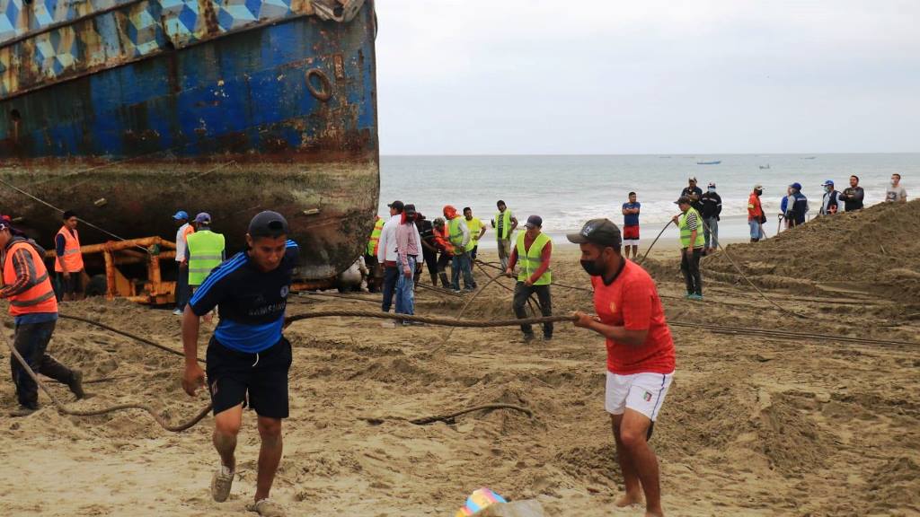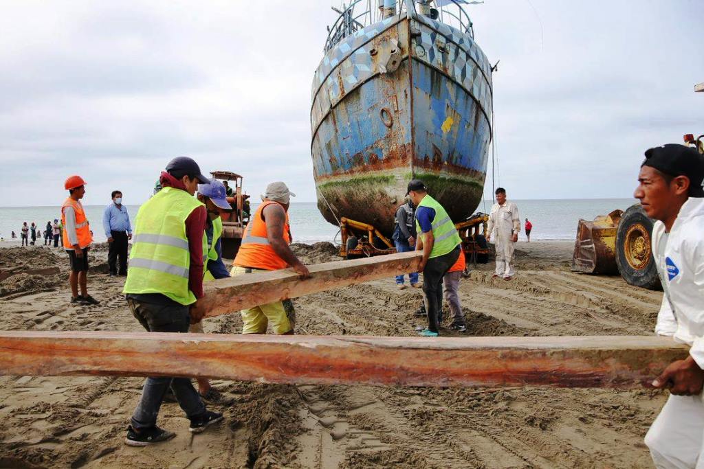En este paso se ha tenido complicaciones para sacar el barco de la orilla, por lo que se pidió apoyo de más maquinaria para intentarlo este martes 14 de septiembre a fin de repetir el proceso de tiro, ya que se estancó a causa del oleaje agitado.