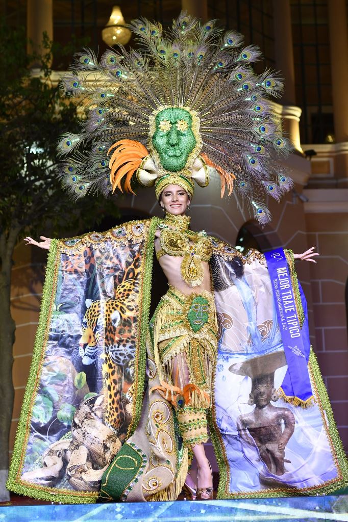 En la noche cuando las candidatas fueron presentadas en público para elegir el Mejor Traje Típico de la región, María Luisa lució el exuberante atuendo Diosa Umiña diseñado por el manabita Manolo Loor.
