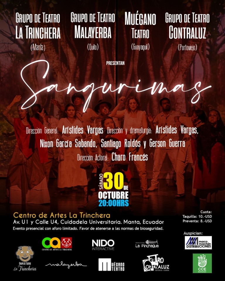 Sangurimas, obra teatral de gran formato, tendrá dos funciones especiales en Manta (Ecuador) a día seguido: viernes 29 y sábado 30 de octubre del 2021 en el Centro de Artes La Trinchera.