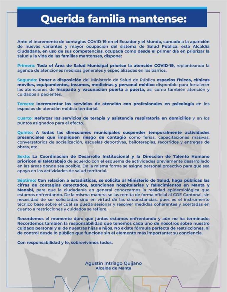 El vertiginoso contagio de la enfermedad COVID-19 entre personas a causa de la variante ómicron del coronavirus SARS-CoV-2, ha motivado que en la ciudad de Manta (Ecuador) sus autoridades públicas endurezcan las prevenciones sanitarias.